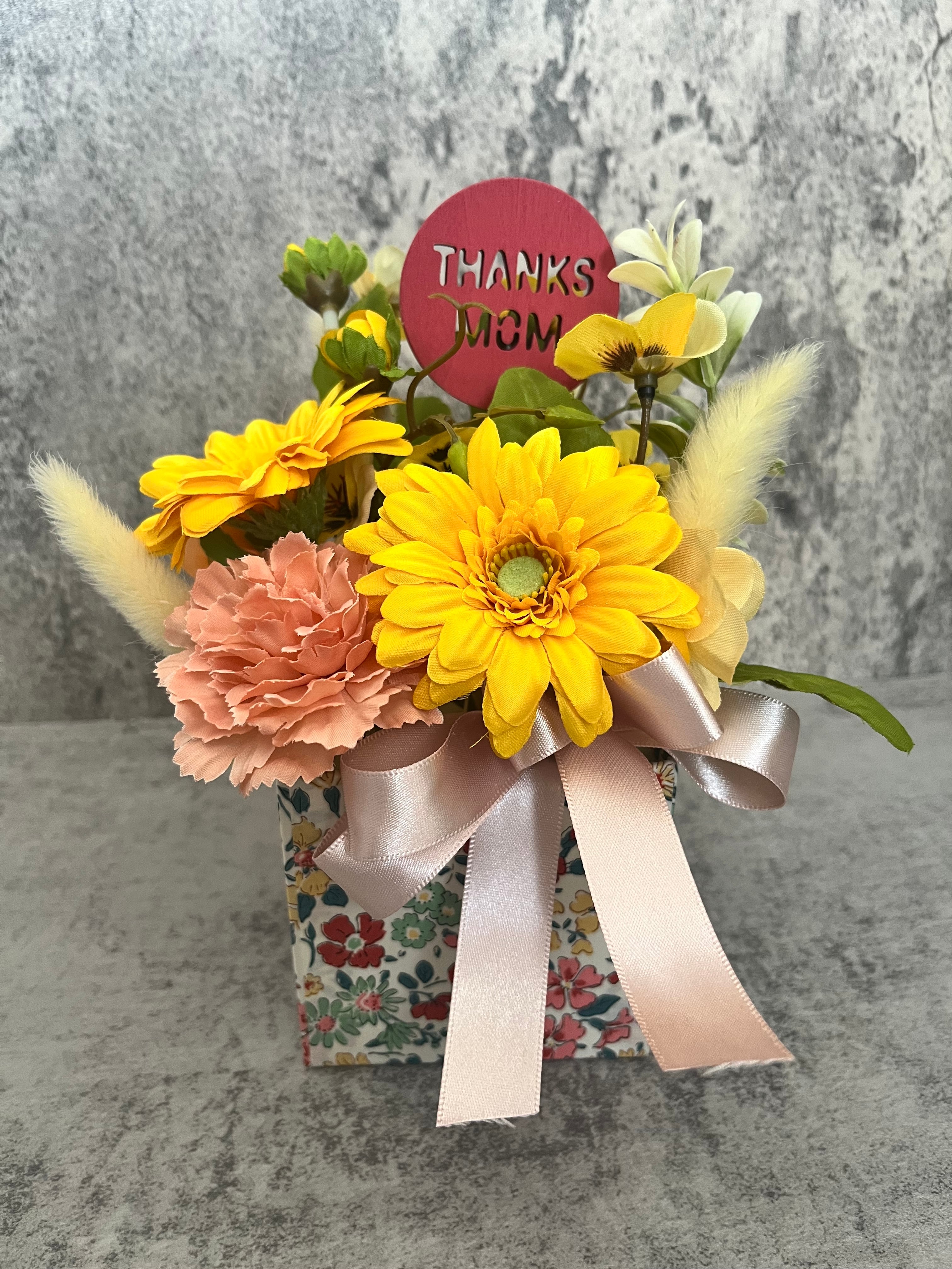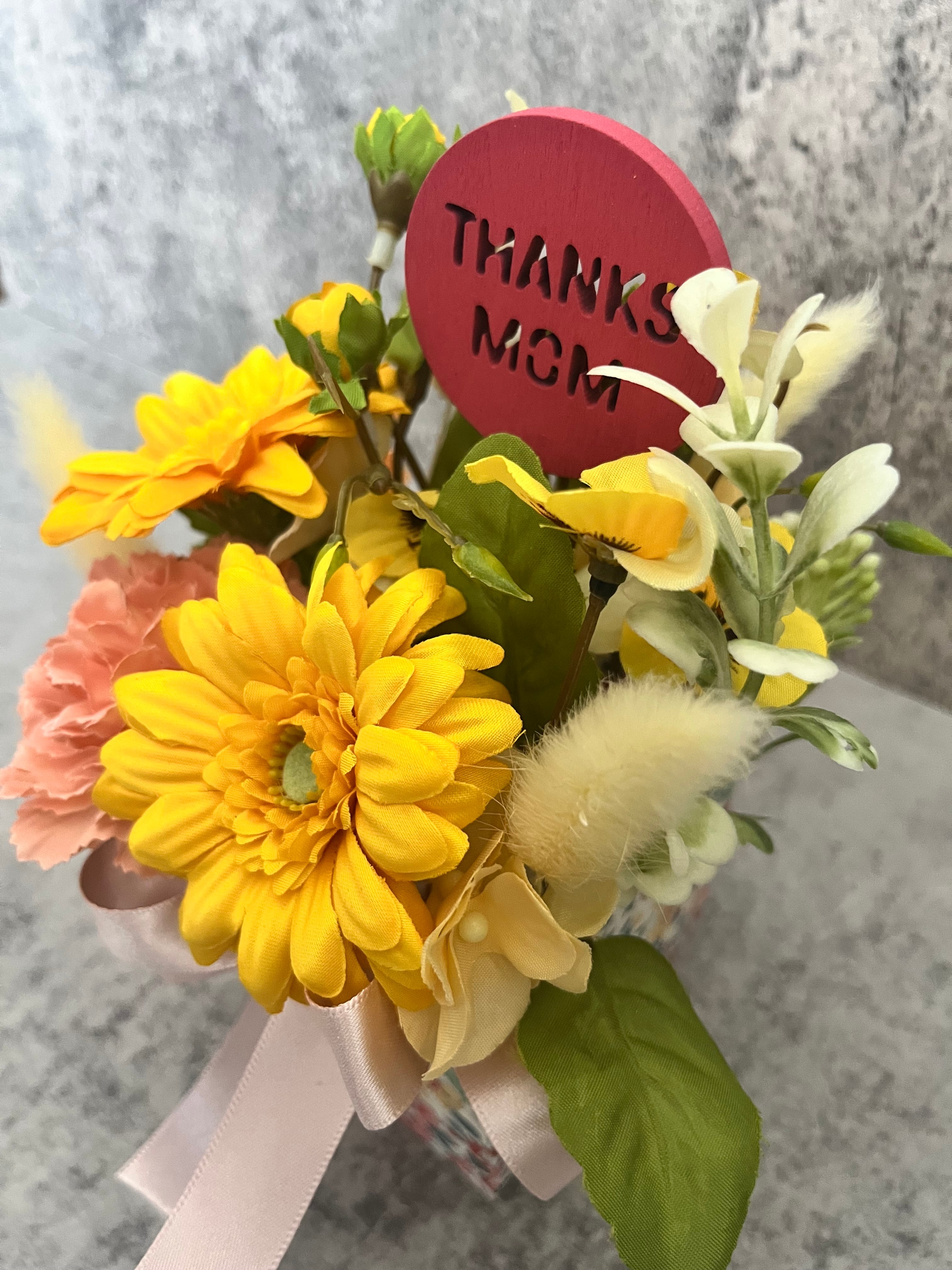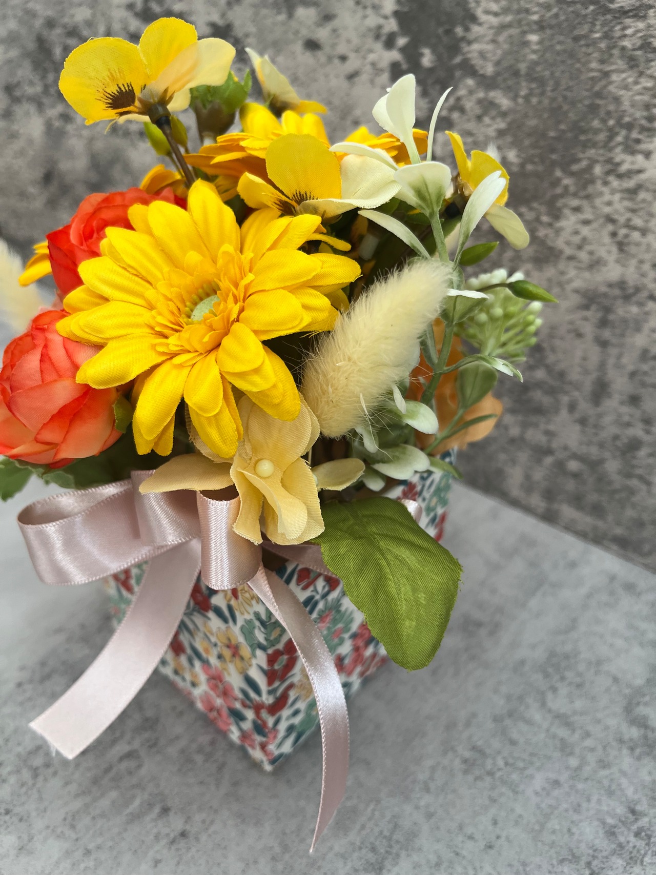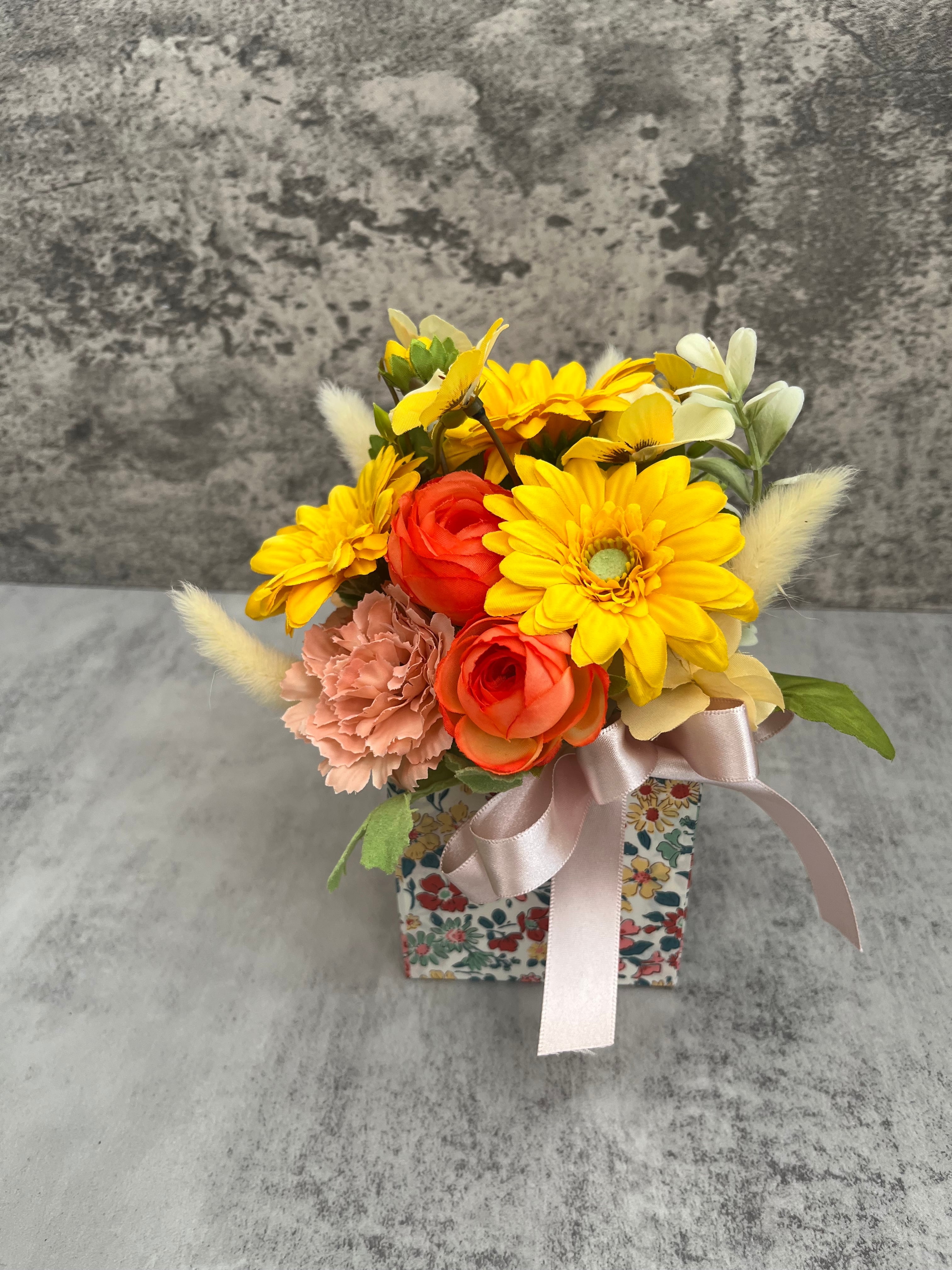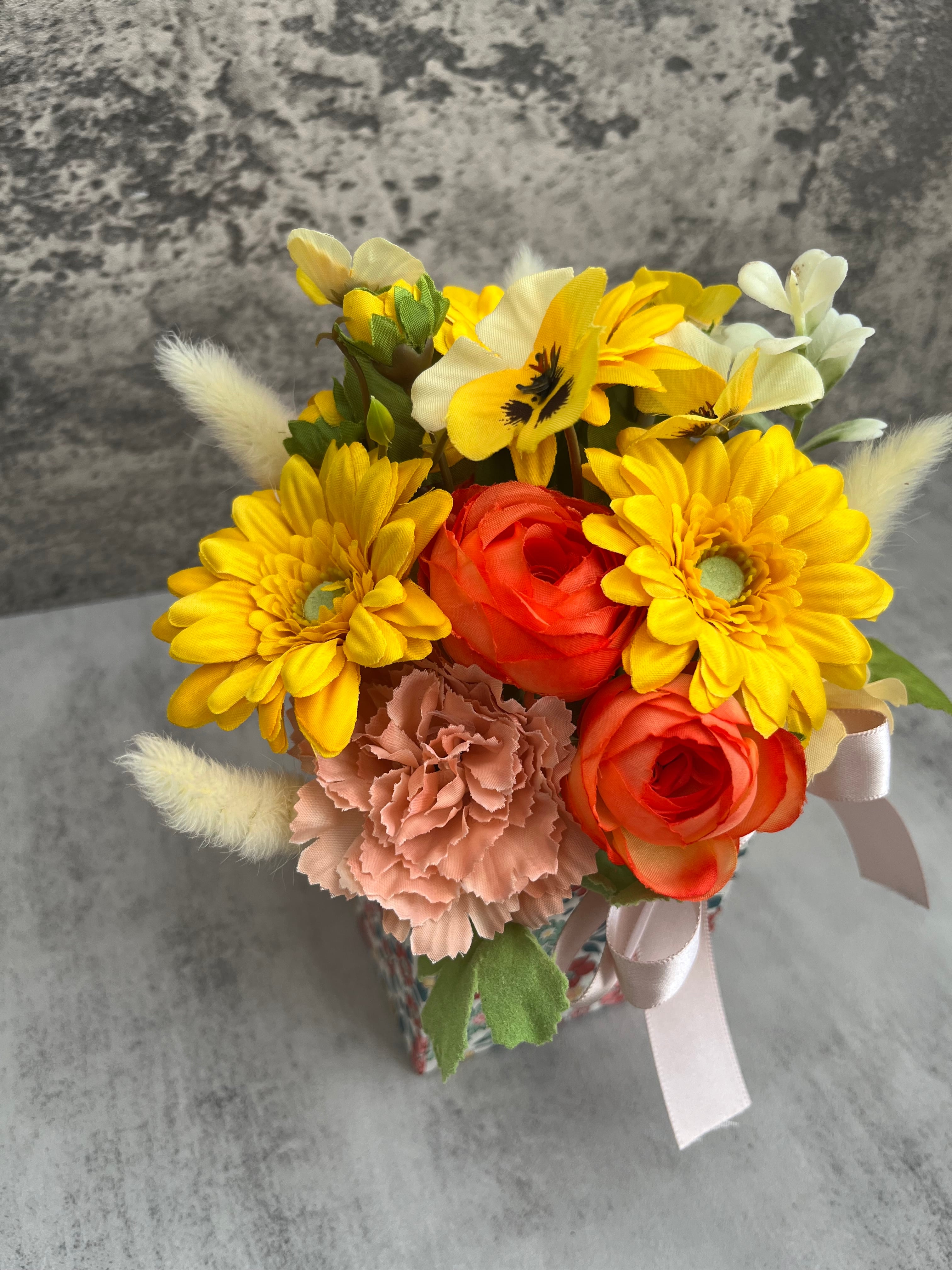 器に似合うビタミンカラーのアーティフィシャルのガーベラをメインに、春のラナンキュラスやパンジーをアレンジしました。
