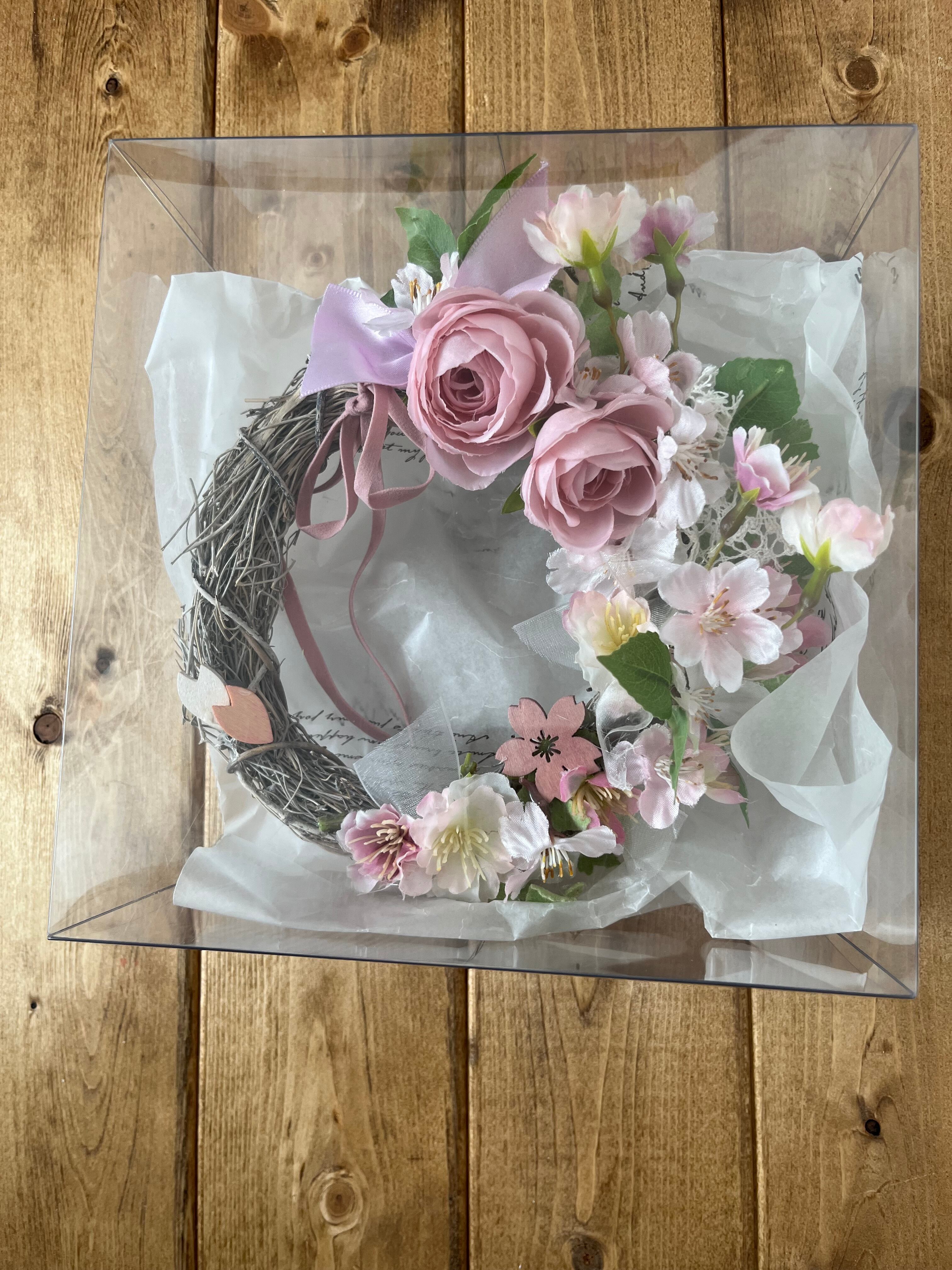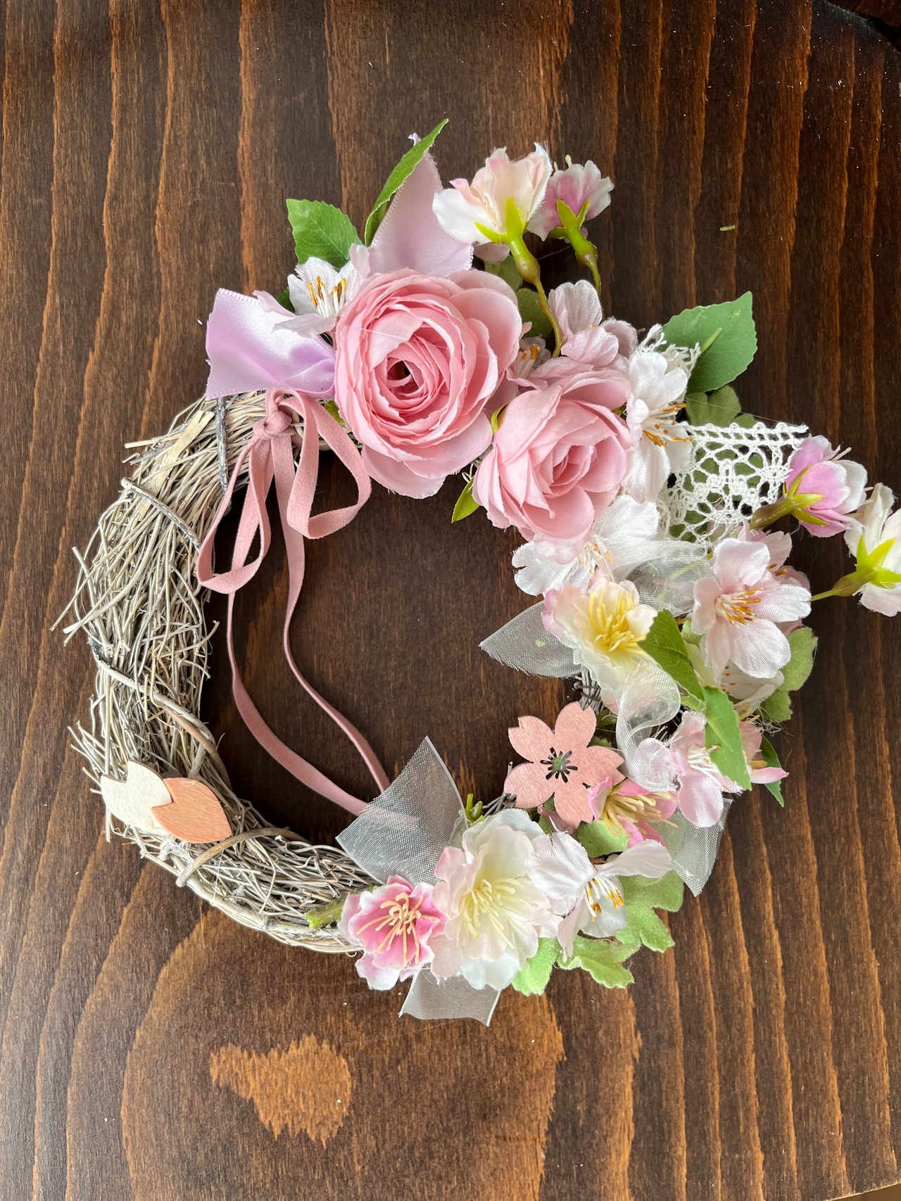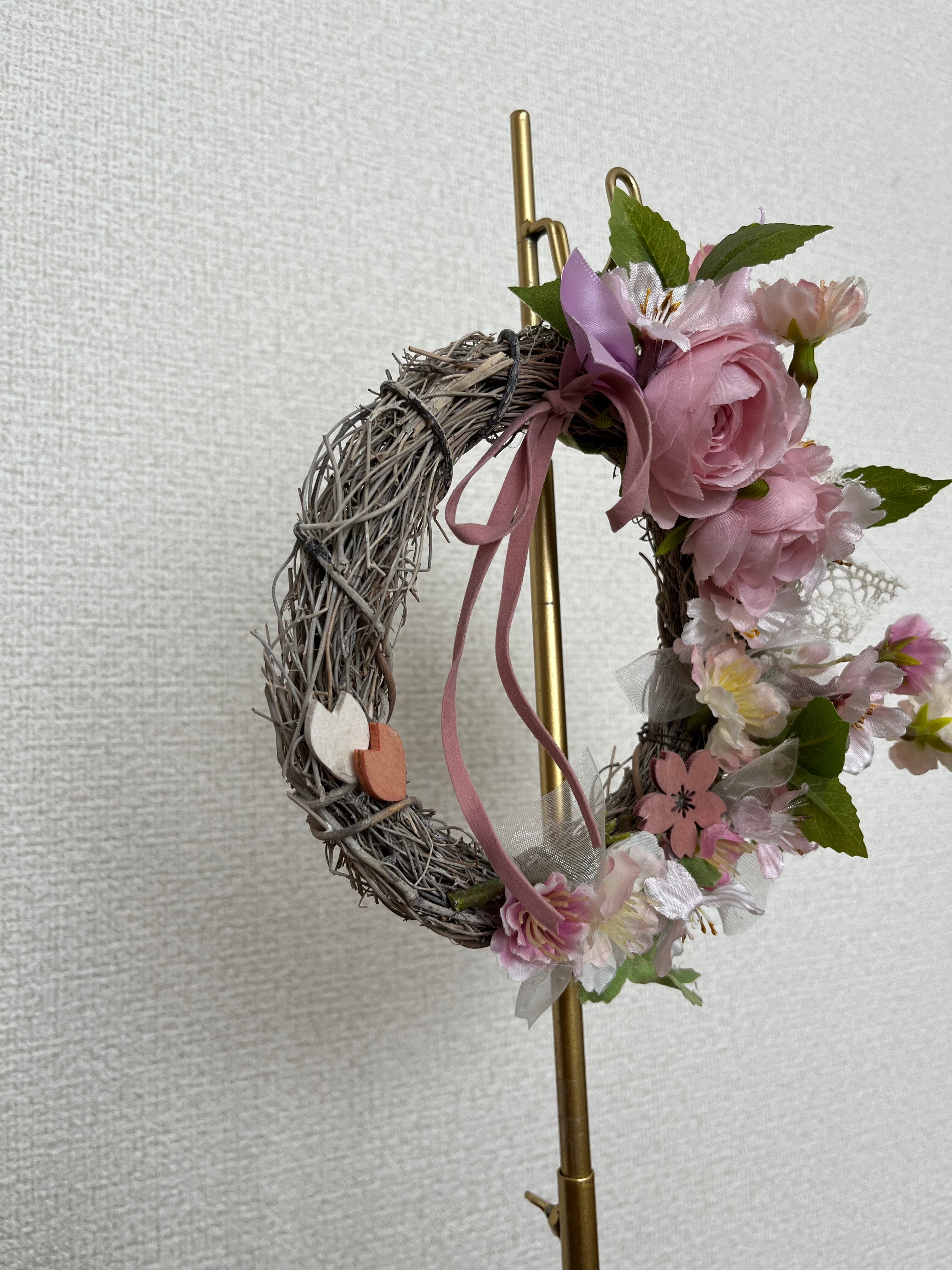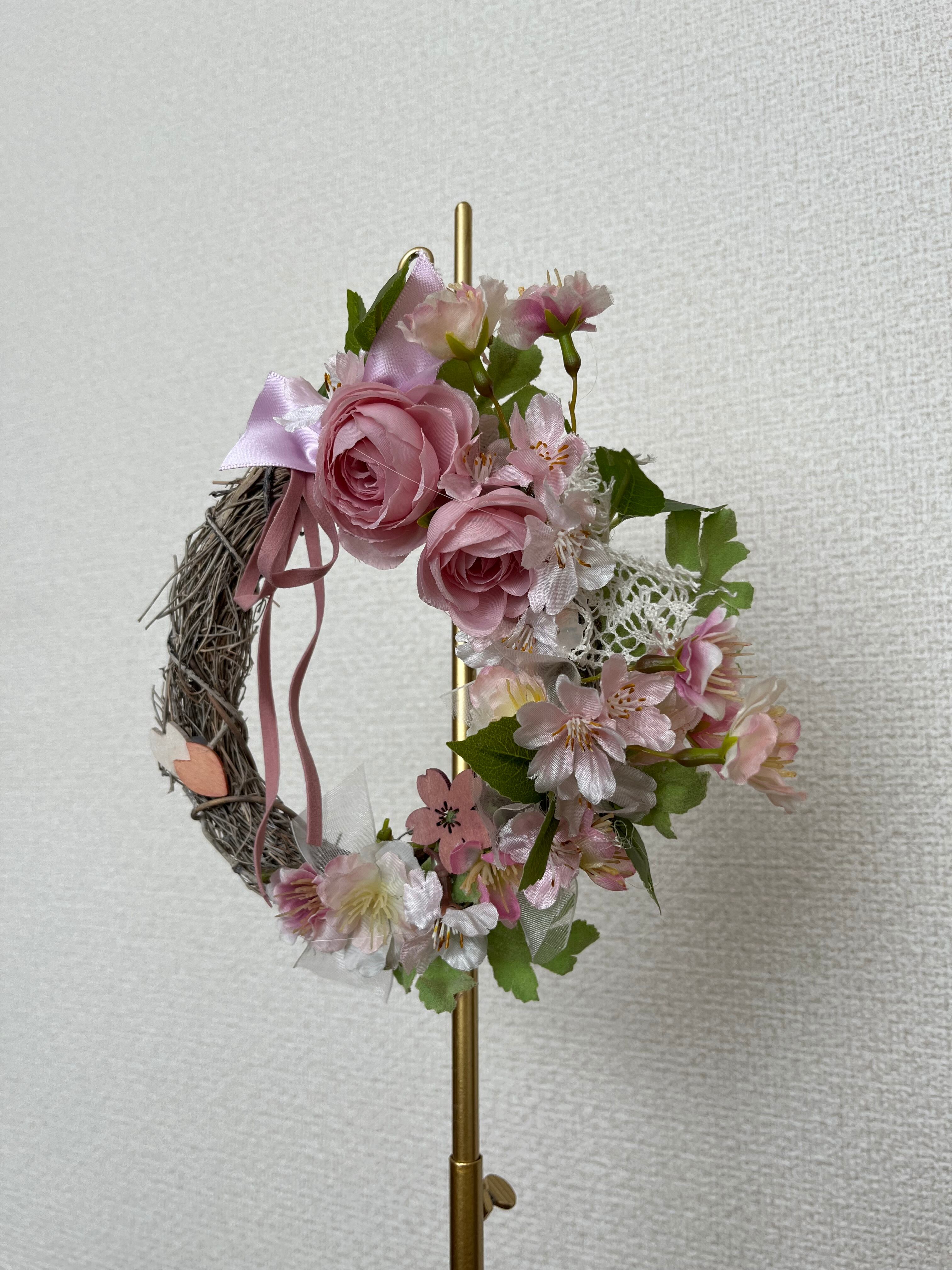 直径18cm、春を呼ぶ桜とラナンキュラスのリース。数種類のリボンも可愛く、ウッドパーツの桜も散らしてナチュラルな風合いも。
