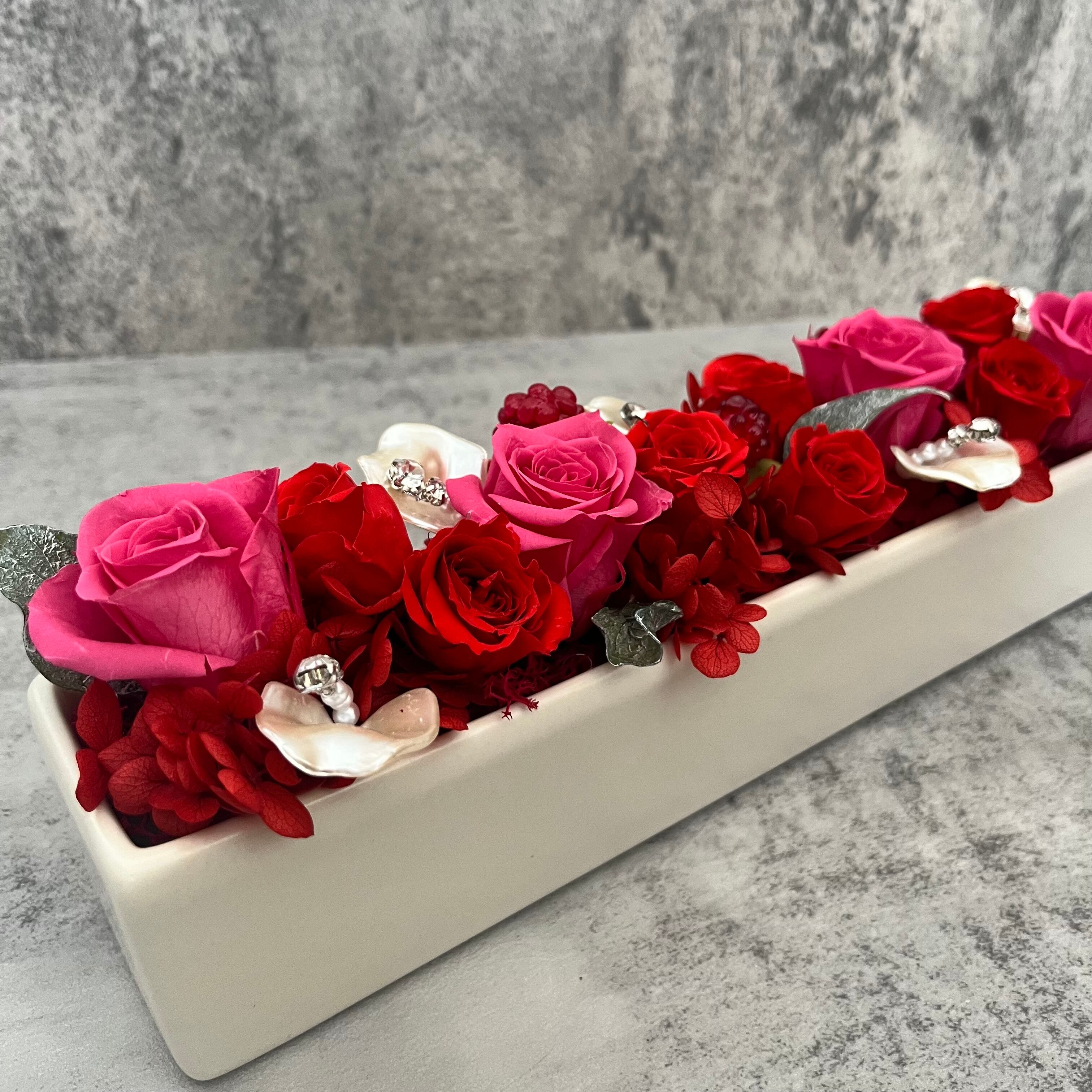 母の日らしい鮮やかな赤とフランボワーズピンクのプリザーブドローズやベリーを、贅沢に陶器の花器に詰め込んだアレンジ。