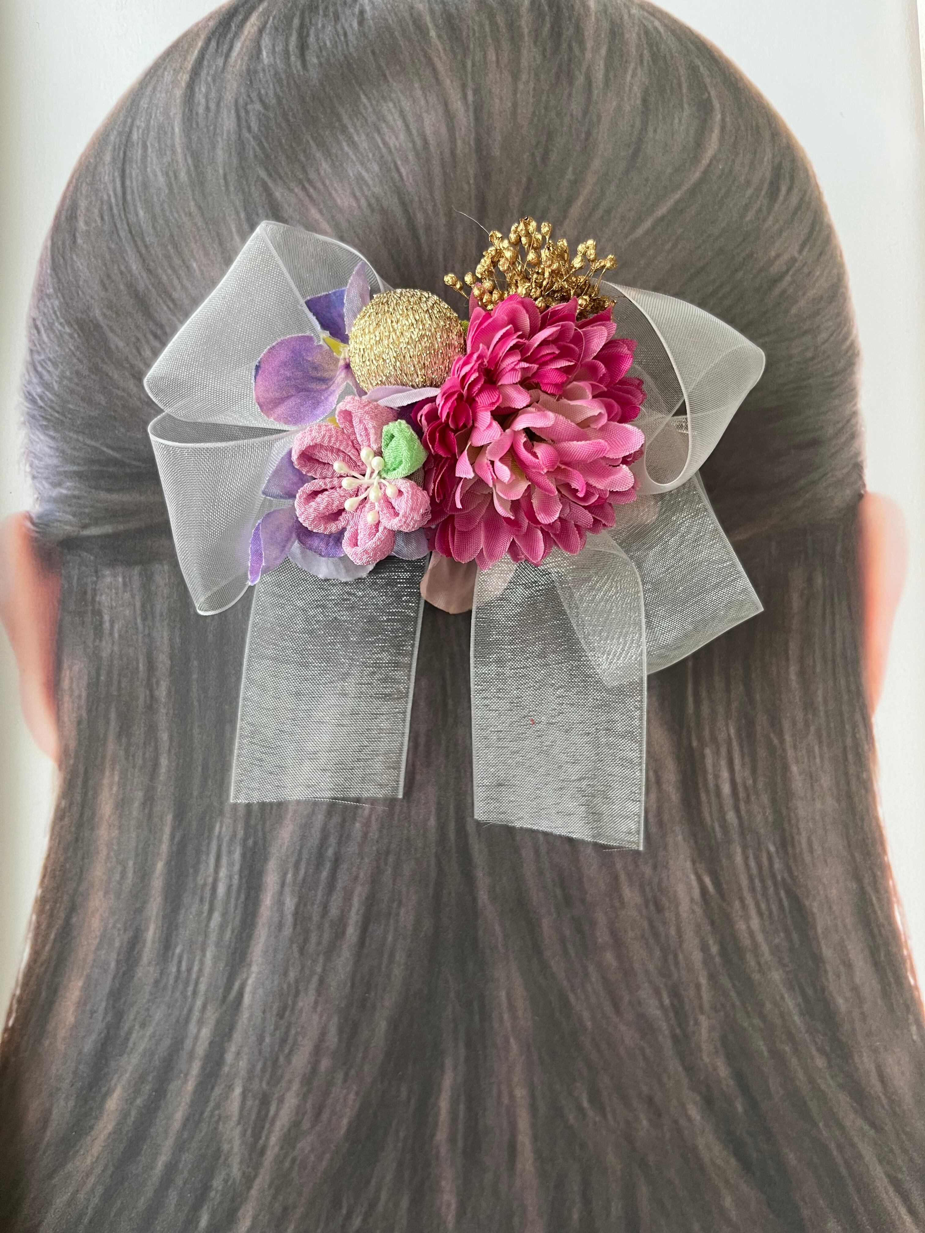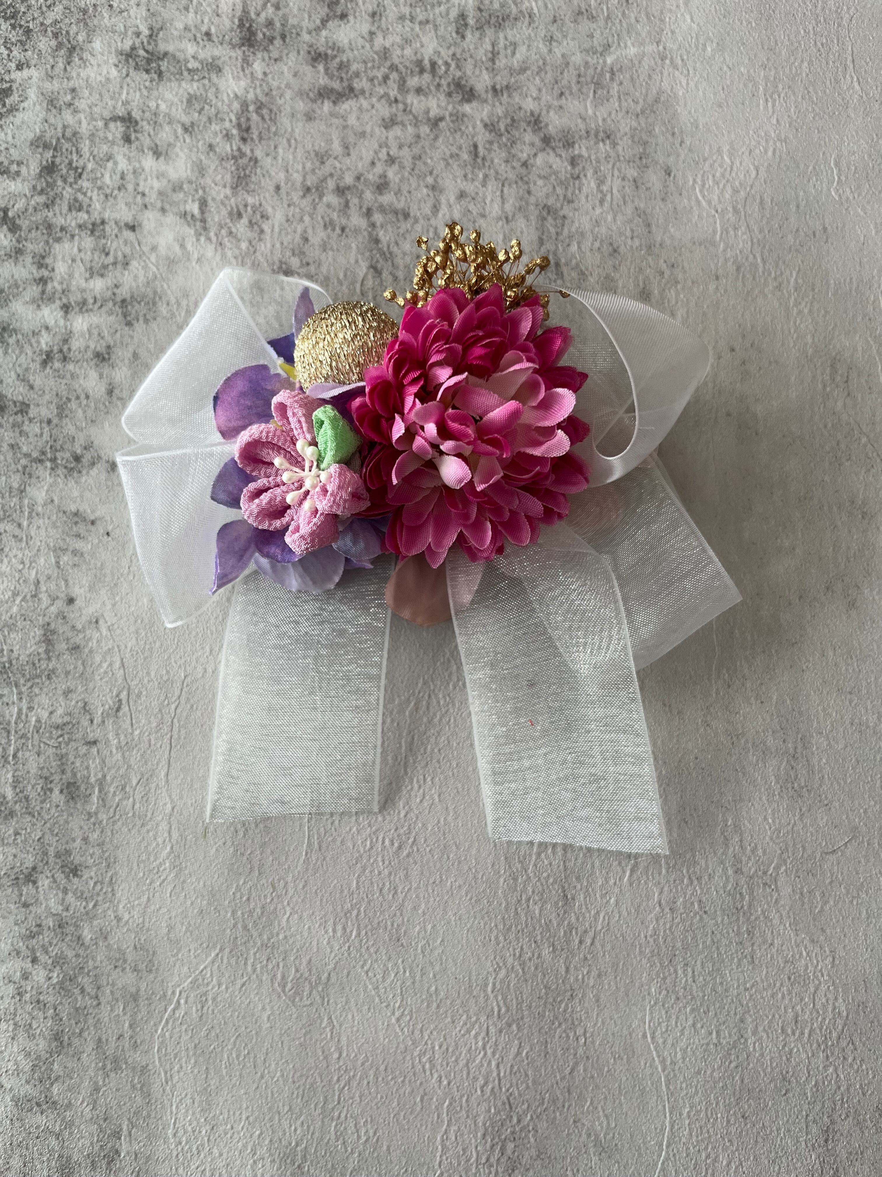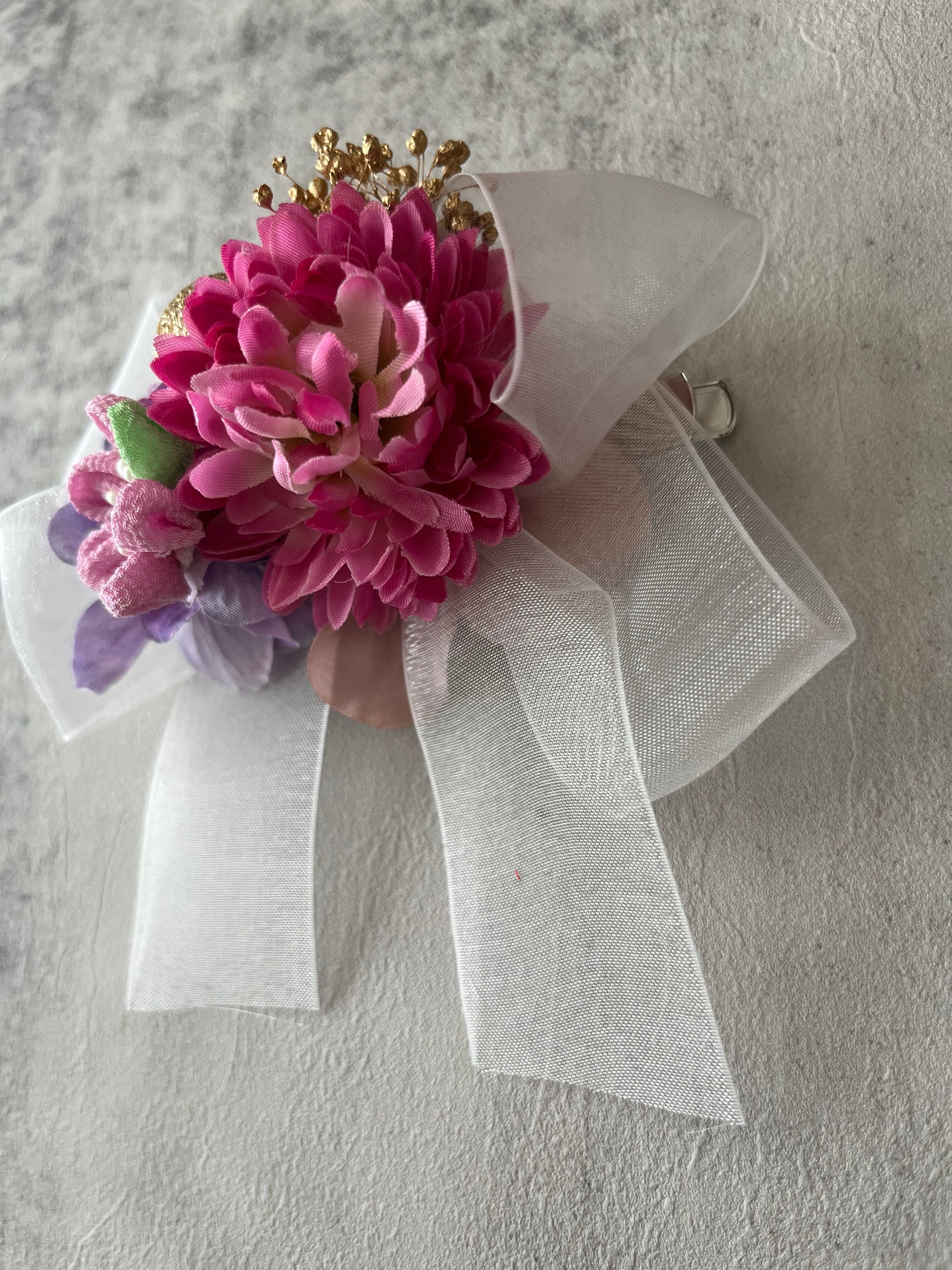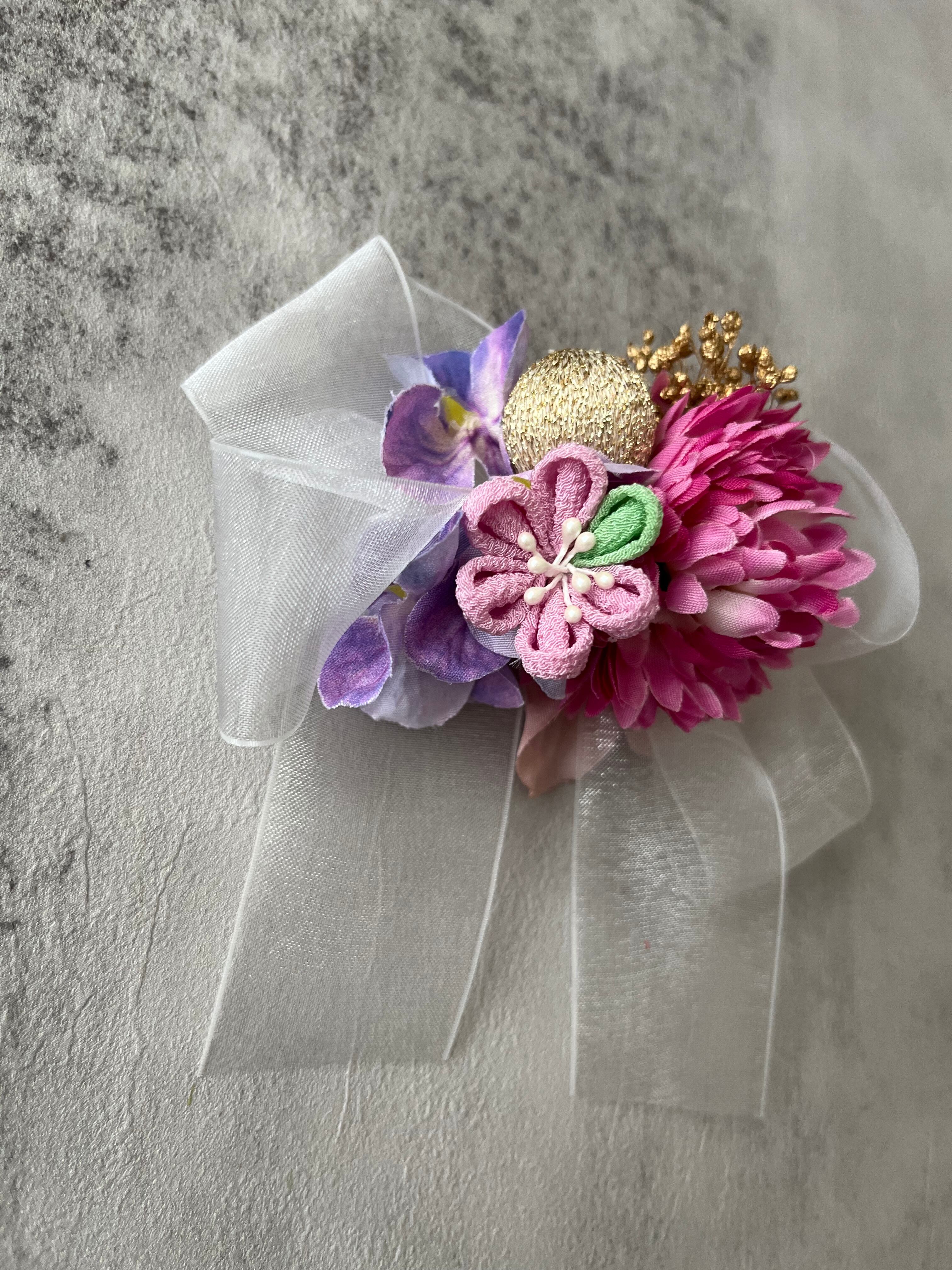 ふんわりしたオーガンジーリボンをベースにアーティフィシャルの鮮やかなピンクマムにつまみ細工の花や小花を合わせ、華やかさと柔らかさが一体に。