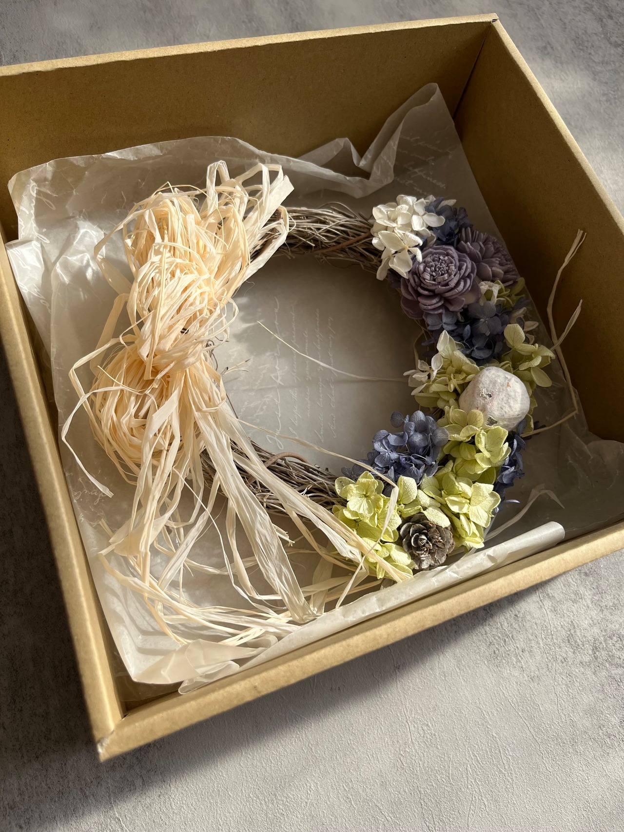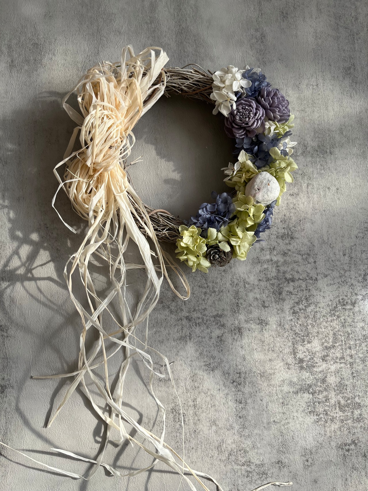 プリザーブドのアジサイ、かすみ草、ラグラス、ユーカリ。ソーラーフラワーのローズを使用。