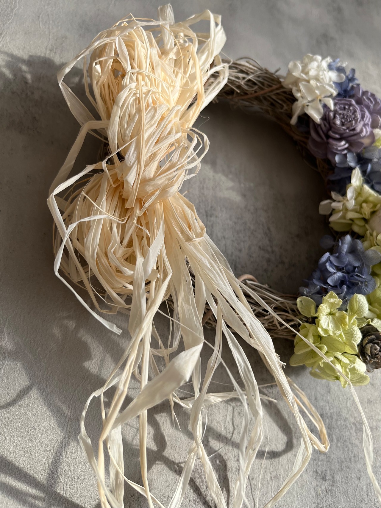 ラフィアリボンのボリュームと長く垂らしたデザインもお洒落。