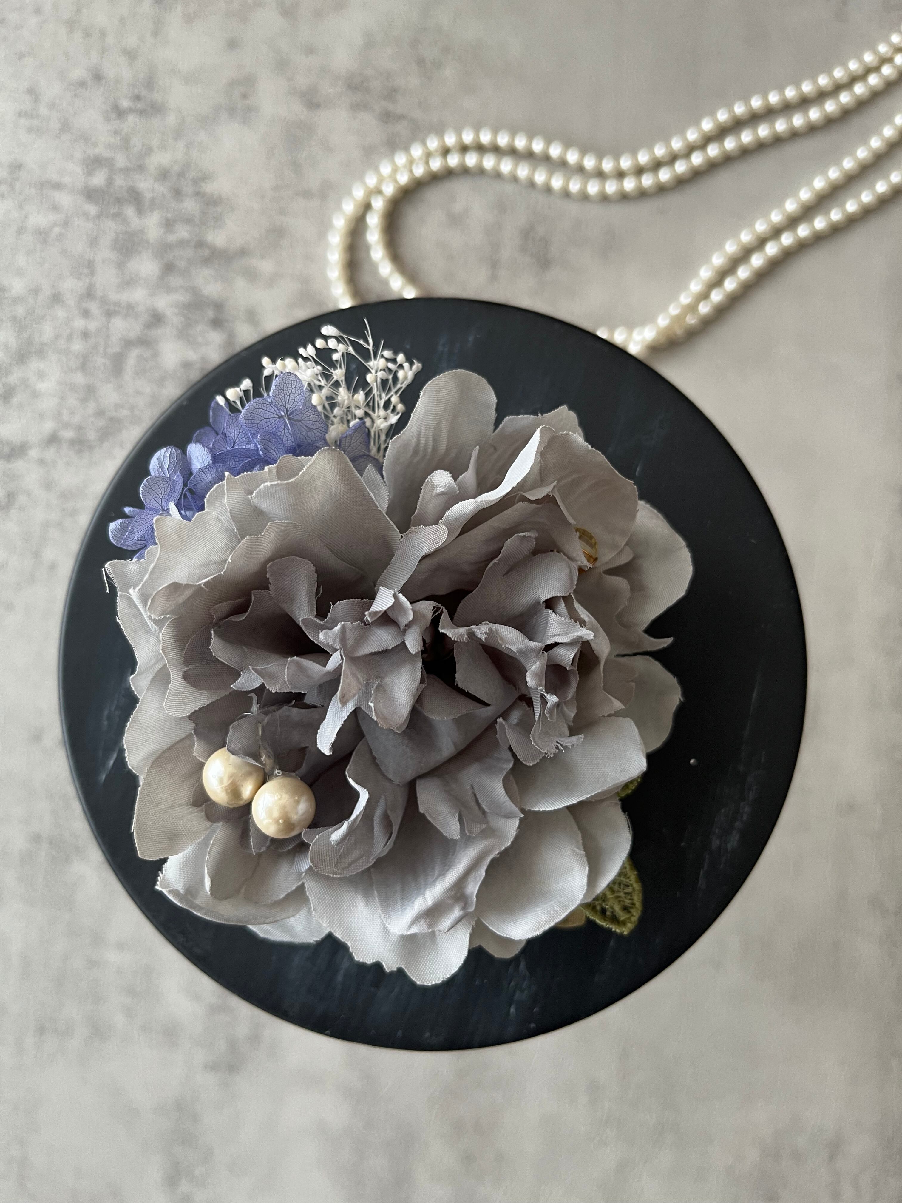 ふんわりしたアンティークカラーのピオニーをメインにアジサイやリーフを添え、上品にパールを合わせました。