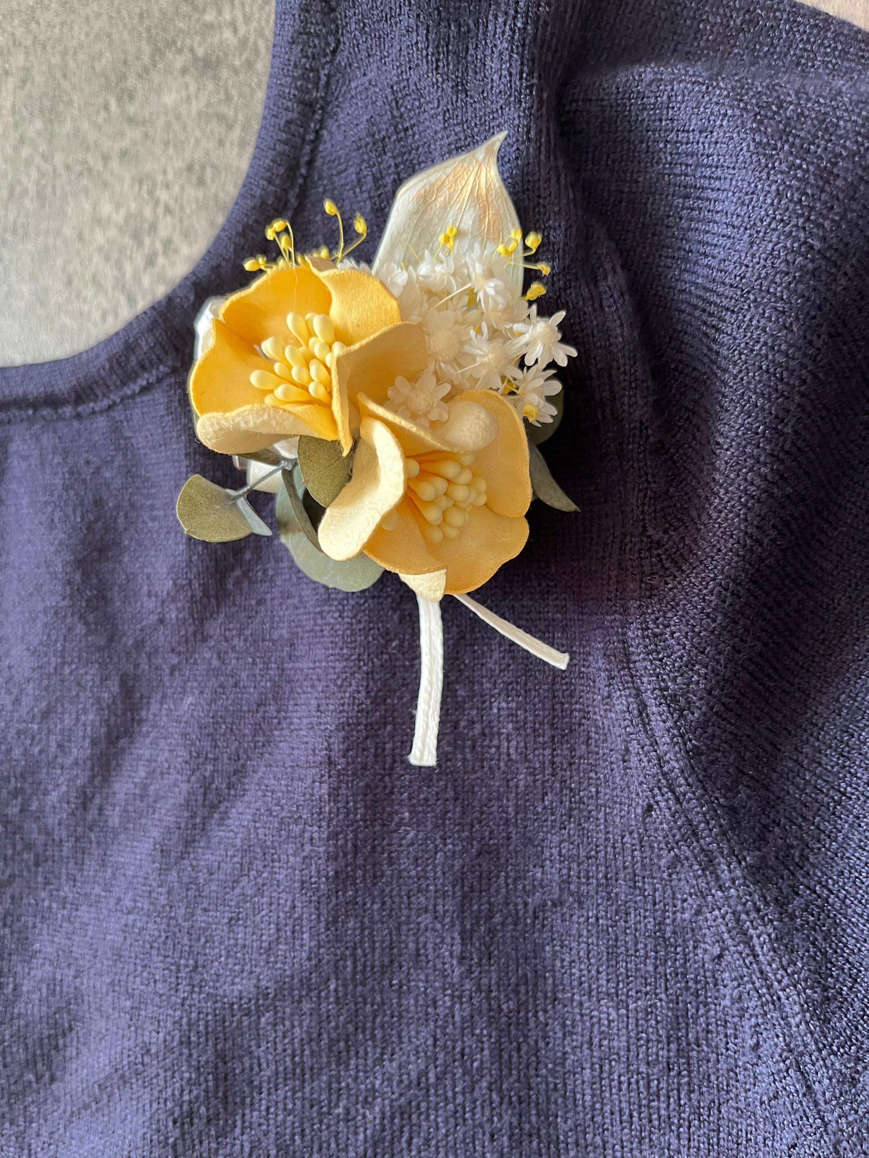 コサージュよりも気軽につけられる、布花やプリザーブドを小さな花束のようにしたブローチです。