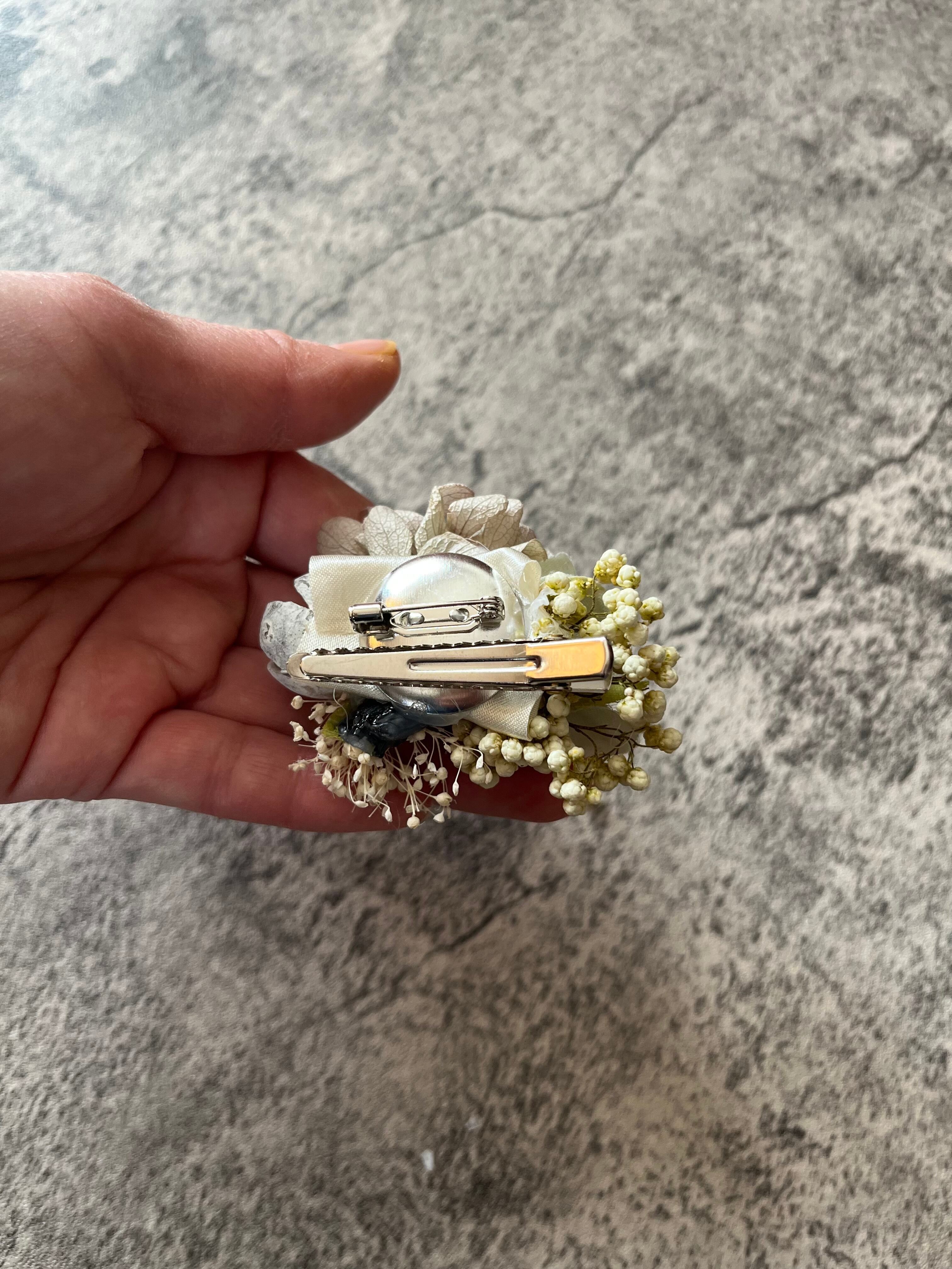 コサージュよりも気軽につけられる、布花やプリザーブドを小さな花束のようにしたブローチです。